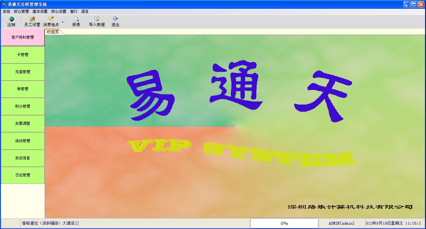 “易通天”会员管理系统 根据酒店、会所的会员业务流程,已开发出充值、押金、消费、积分、活动、券、报表分析等功能。针对不同的管理模式能非常灵活的为企业服务,在功能设置中,根据不同的管理模式,可对主卡、副卡、匿名卡,使用卡状态、激活、发票、赠送方式、积分方式、券有效期等进行不同的设置,从而达到灵活的管理需求。